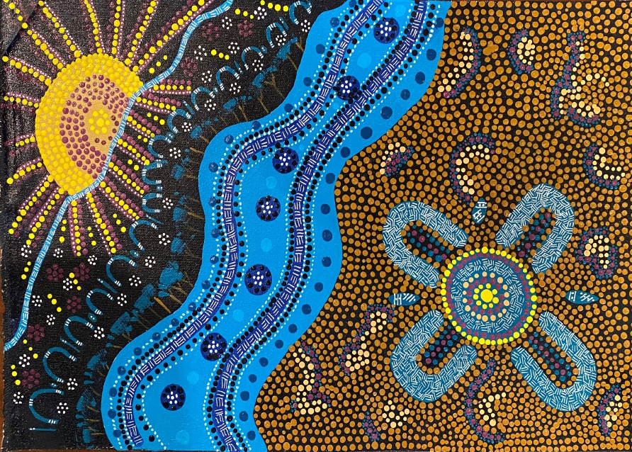 This is a postcard of a painting by an Indigenous artist living on the Gold Coast. Jenny is a First Nations woman therefore she designs her paintings based on her own dreamtime. For instance she may dream about where her family grew up. Her art work also involves story telling using different techniques also including dot painting.